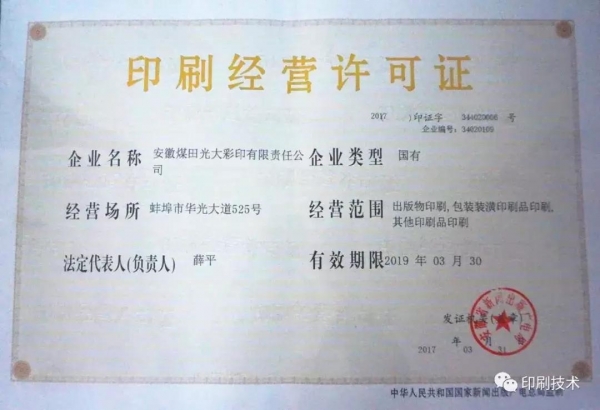 圖為安徽煤田光大彩印有限責任公司印刷經營許可證
