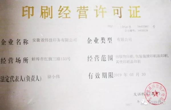 圖為安徽省偉佳印務有限公司印刷經營許可證