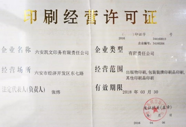 圖為六安凱文印務有限責任公司印刷經營許可證