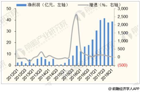 2012-2018年Q1造紙行業單季度歸母利潤及增長情況