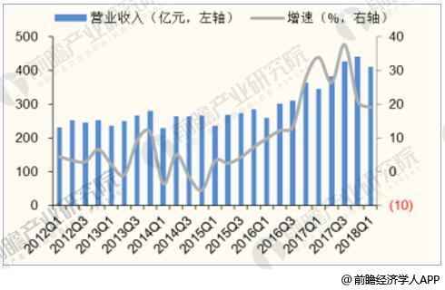 2012-2018年Q1造紙行業單季度營業收入及增長情況