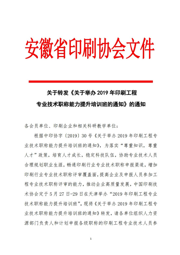 關(guān)于轉(zhuǎn)發(fā)《關(guān)于舉辦 2019 年印刷工程 專業(yè)技術(shù)職稱能力提升培訓(xùn)班的通知》的通知