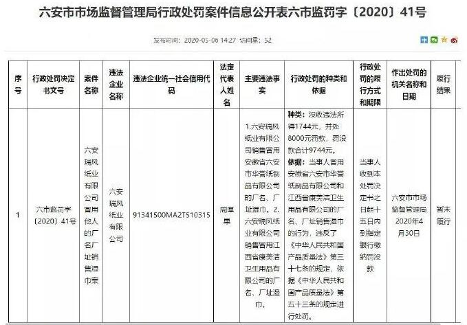 近日,六安市市場監督管理局發出行政處罰案件信息,其中,六安瑞風紙業有限公司冒用廠名、廠址被處罰。違法事實:1.六安瑞風紙業有限公司銷售冒用安徽省六安市華譽紙制品有限公司的廠名、廠址濕巾。2.六安瑞風紙業有限公司銷售冒用江西省康美潔衛生用品有限公司的廠名、廠址濕巾。