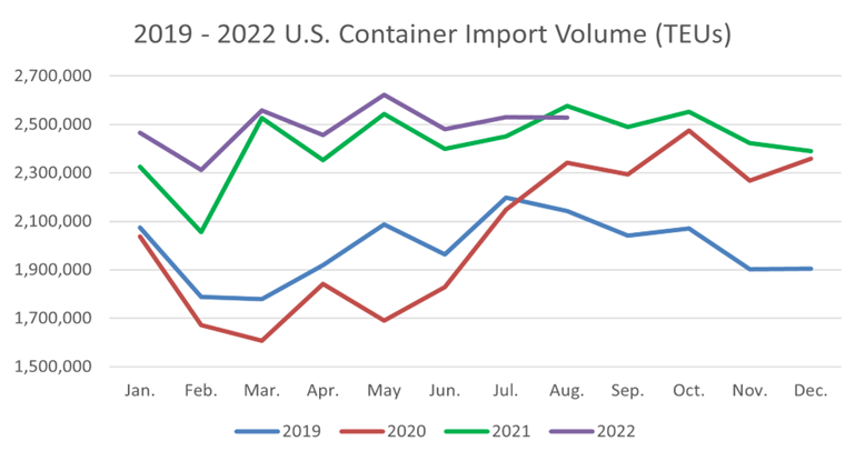 并且,8月份美國從中國的集裝箱進口量比2022年7月增長1.4%,達到100.85萬TEU,較2021年同期增長6.3%。意味著美國8月份美國從中國進口的箱量創歷史新高。這也打消了國內傳聞的上海封城后大量訂單轉移的疑慮。